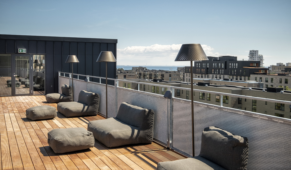 Reception, bar, lounge og morgenmadsrestaurant er placeret på 4 etagemed udgang til veranda og tagterrasse. Indtag morgenmaden fra kl. 05 på den skønne veranda, eller nyd dine drikkevarer fra baren på tagterrassen med udsigt til Øresund.